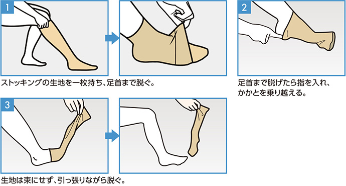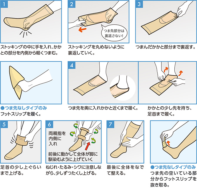 - 弾性ストッキングは、たぐって生地をまとめないようにしましょう。履きにくくなります。