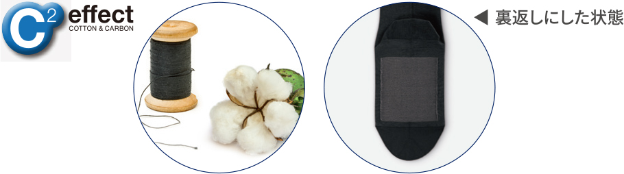 靴下底部分の生地に活性炭入り繊維を用いています。 - 快適な着用感と肌ざわりの向上のために生地にコットンを採用しています。